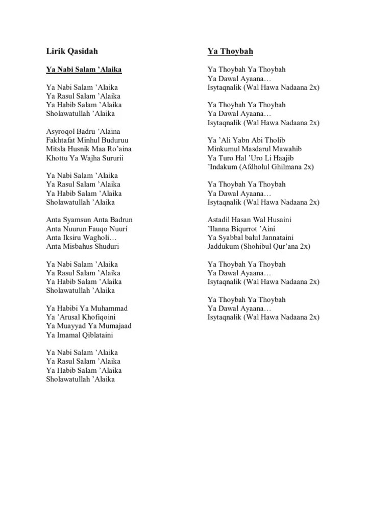 Layanan mobile dari situs entertainment terbesar indonesia, kapanlagi.com. Assalamu alayka ya ya rasool allah Lirik sholawat assalamu'alaika ya rosulallah (roqqota aina)assalamualaika ya habibi ya nabiyya allah. Fahda' ya qalbu wa rifqan. Wa li taibata tharafat 'ishqan.